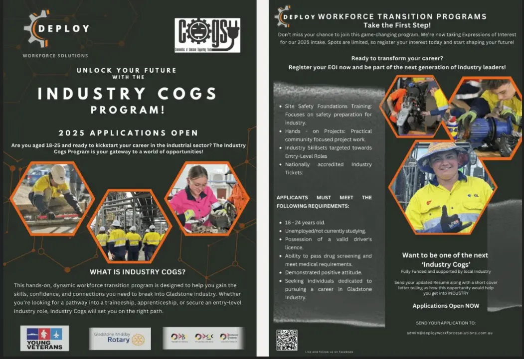 Participants will gain experience on practical, community-based projects while building confidence, teamwork, and job readiness. With a strong focus on safety, employability, and a positive work mindset, Industry Cogs is more than a training course—it’s your gateway into Gladstone’s thriving industry workforce.